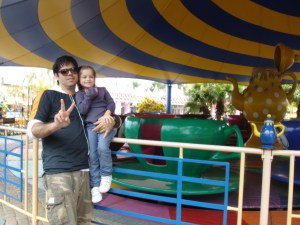 Logo ao lado do carrocel partimos para um brinquedo mais radical, pelo menos para mim que enjoo fácil, a Chicara maluca! Para quem esta lendo pode parecer um brinquedo inofensivo mas basta um olhar mais atento, que vera o masoquismo na cara das pessoas ao entrar naquele torturador em forma de chicara. Já na fila fiquei com náuseas só de olhar aquelas pessoas rodopiando a 300 km/h. Resolvi ir com a minha filha somente, mas me arrependi pois a criança inocente se transformou em um ” monstrinho” ao entrar no brinquedo, e não queria para de girar e rodar, mesmo vendo a pele verde do pai.