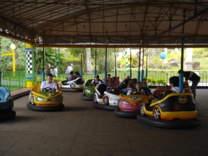 Após tanta emoção resolvemos que o próximo brinquedo seria um mais tranquilo, foi quando vi logo a frente os carrinhos de bate-bate, eu larguei todo mundo e já fui para a fila, logo em seguida chegaram os outros 2 homens da família, meu pai e meu filho. Fomos 2 vezes, pareciam 3 crianças, não só uma, eu sai com o joelho doendo, pois bati no volante ao ter colidido de frente com uma criança de 7 anos mal intencionada.