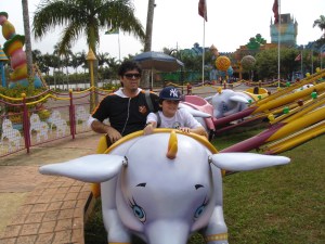 Já refeito do enjoo causado pela chicara, decidimos que agora iríamos para brinquedos mais radicais, escolhi o Dumbo! Claro era um brinquedo onde toda a família poderia se divertir e ainda com doses de adrenalina, ja que o singelo elefantinho podia subir e desce conforme nossos controles.