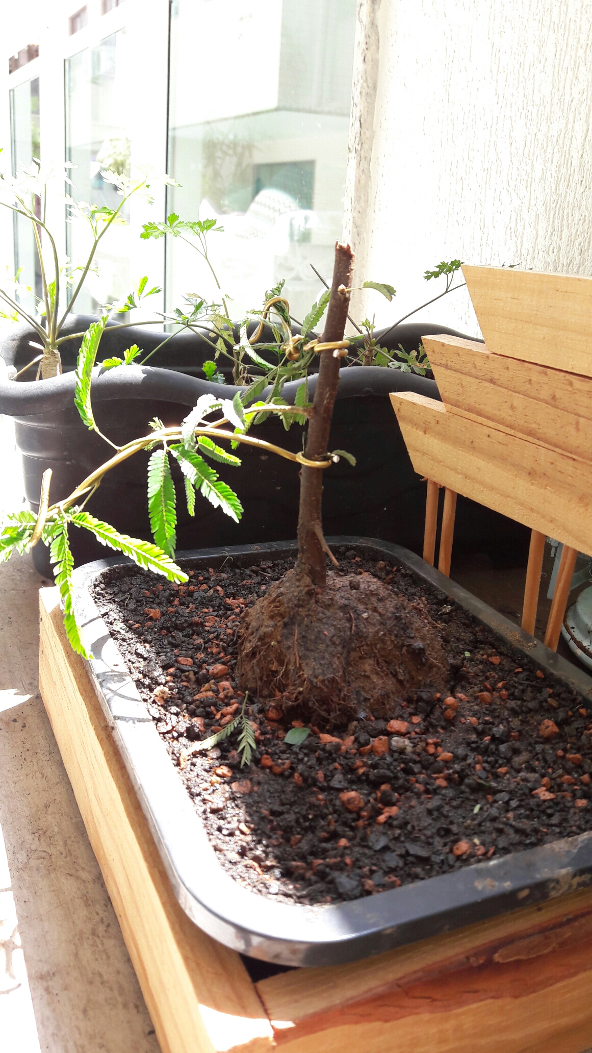 Meu novo Hobbie . Bonsai, se pronuncia som de s de sapo e não de Z. Comprei uma mini tree e estou apaixonado. Ela chegou ” descabelada “, assiti uns videos e ja dei uma arrumada nela alem de terra adubada. Ja estou venso bonsai em todos os lugares , é um vicio. Existe uns videos do abc do bonzai para quem quiser informações mais certinhas. Aqui abaixo esta a minha . Comprei tbem uma muda de dormideira, cortei o tronco e replantei em um vazo menlr para ver se ela vira um bonsai. É a ultima foto.
