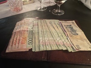 Leve sempre uma bolsa para colocar as notas, é muita nota que você recebe. Olha a foto abaixo o pagamento da conta de um restaurante.