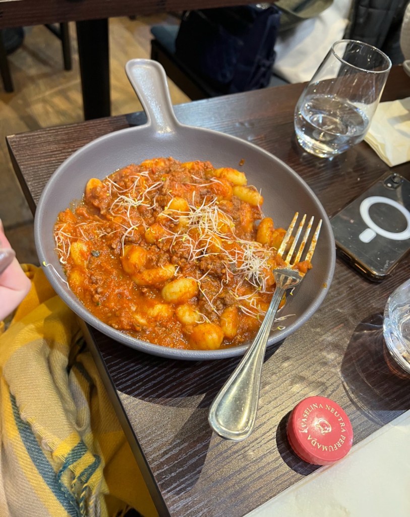 Pedimos gnocchi ao molho pesto, gnocchi à bolonhesa e uma lasanha clássica, servida ainda borbulhante no forno de barro. Todos os pratos chegaram bem montados, porções equilibradas, massa fresca, os molhos com textura e tempero na medida.