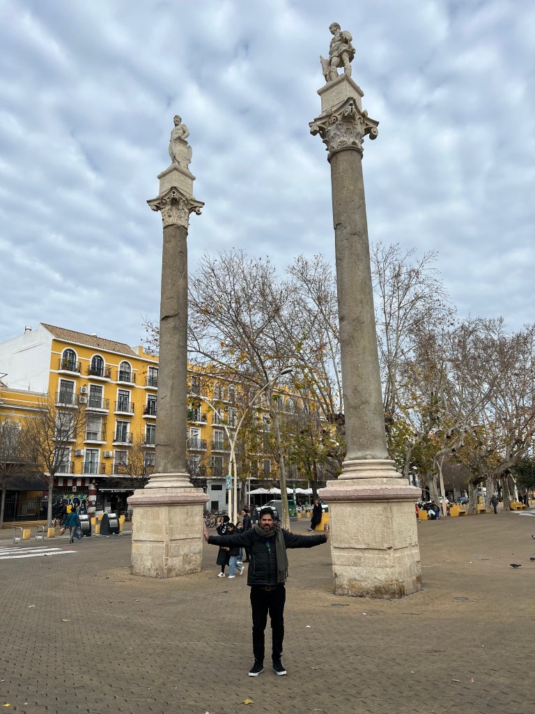 As colunas que estão hoje na praça foram erguidas no século XVI, trazidas das ruínas romanas de Itálica (cidade natal do imperador Trajano, a poucos quilômetros dali). No topo, estão as estátuas de Hércules e Júlio César, dois nomes ligados à fundação mítica e histórica da cidade.