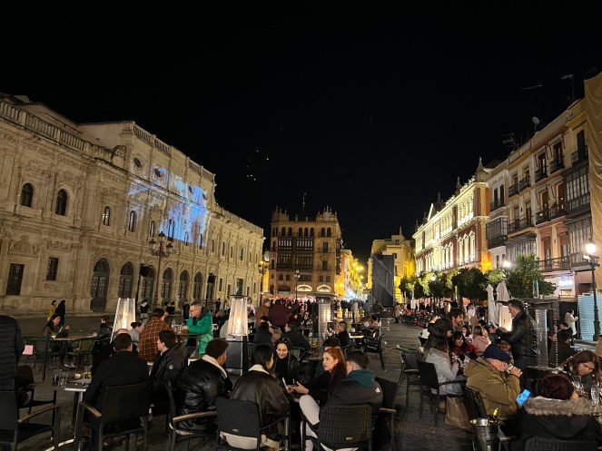 Seguimos andando e, de repente, caímos numa praça em frente à prefeitura — Plaza de San Francisco. Vários prédios antigos, um centro gastronômico com projeção de shows nas fachadas e restaurantes cheios de gente, vinho e alegria. Sevilha parecia em festa — mesmo numa noite comum de fevereiro.